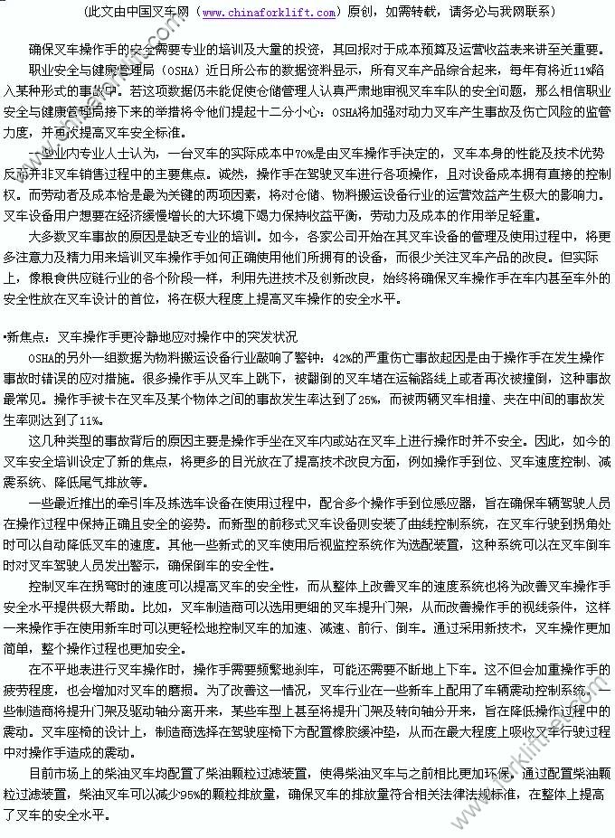 中国叉车安全网(www.forkliftsafety.com.cn)尊重合法版权,反对侵权盗版。(凡是我网所转载之文章,文中所有文字内容和图片视频之知识产权均系原作者和机构所有。文章内容观点,与本网无关。如有需要删除,敬请来电商榷!)