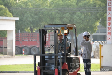 (力至优售后服务人员进行叉车安全驾驶的规范动作演示)