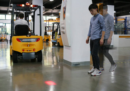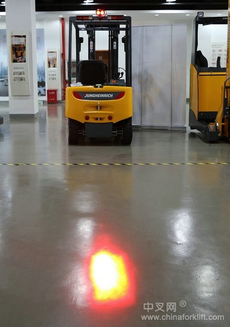 叉车加装红光警示灯能在叉车行驶方向前方5米左右地面形成一块长方形的红色光,在复杂的仓库空间里,特别是噪音比较大的环境中,可以对行人以及其他工业车辆起到提前的警示作用,告知前方或者转角有叉车过来,注意安全避让,避免叉车撞人事故的发生。