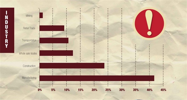 物料搬运行业中发生最多的行业是制造行业,其事故发生率超过了40%。其次,约有24%的事故率来自于建筑行业。批发商、运输业和零售业所发生的事故率分别为12%、11%和9%。事故率发生最低的是采矿业,只占行业事故率中的2%左右。