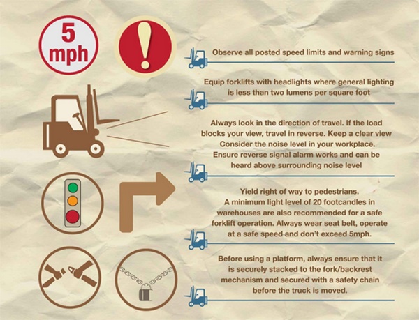 5.当叉车移动的时候确保安全链和货叉上的货物安全的堆放