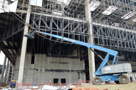通过使用吉尼高空作业平台以及设备租赁公司的积极沟通,西博城从今年6月开始正式进入高空作业平台使用施工阶段并将会贯穿整个项目。目前项目正处于中期的高峰阶段,使用最大量达100多台,帮助实现并营造“高标准,高起点,高度创新”的西博城。“中期高空作业平台的使用范围主要是用于钢结构立柱防火材料的喷涂。后期会大范围使用高空作业平台用于主入口大厅的控透幕墙的安装,室内装潢装饰及消防管道管线,电路电线的安装。”高空作业平台租赁公司项目负责人介绍道,“移动脚手架、工程‘飞艇’之类的传统高空作业工具一直以来都在安全管理和整体构造部分有着明显的缺陷,因此事故发生率非常高。而现在,在西博城建筑工地,这些设备都被安全系数高得多的吉尼高空作业平台取代了,这一种高安全系数的施工设备取代传统落后的施工设备的趋势是必然的。”