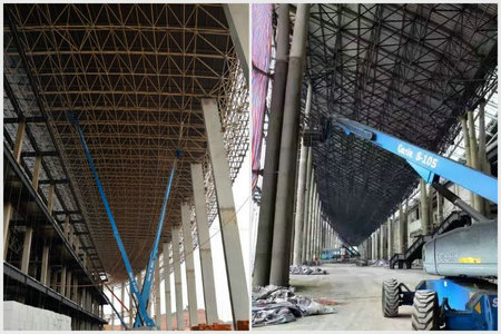 就在此时,吉尼高空作业平台给西博城的建设指了一条明路。场馆内的钢结构立柱高达35米左右,屋顶面积达30万平方米,工程量大,对施工的稳定性也有一定的要求。因此工作区间在27米至35米区间的Genie® S™-80和Genie® S™-105自行式直臂型高空作业平台能有效提升该工况的生产力,并且吉尼直臂型高空作业平台具有出色的水平伸展能力,可旋转的自调平台可以帮助操作工精确定位到工作点,因而尤其适合西博城涉及到的大量墙柱喷漆施工工作和屋顶排水系统、外墙保温层安装。“吉尼的爬坡能力也令人赞叹。根据货车行驶设计的陡坡度对于吉尼高空作业平台来说也不在话下,工人们可以直接驾驶着它到达楼上进行施工,这省下了安排其他设备吊运设备的麻烦也节省下了很多工时。”高空作业平台租赁公司项目负责人夸赞道。“使用了吉尼高空作业平台后,施工的效率明显提升,相较过去采用脚手架的施工方案效率提高了30%。”