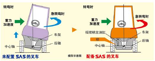 控制器能根据传感器提供的负载、门架举升高度、横向加速度信息,做出危险判断,并在必要时通过锁定油缸锁定后轴,抑制在高速过弯等操作情况下车体的左右摇摆和侧翻倾向。