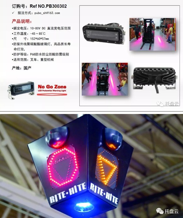 2.蓝点安全警示 Blue Safety Spot 叉车在运行中的警示是通过频闪灯和蜂鸣器来实现的,但是当仓库工作人员在接听电话,或低头整理货物的时候,上述两个措施往往无效。蓝点安全警示,是通过安装在叉车护顶架上的蓝色镭射灯,投射蓝色警示光线到叉车尾部或叉车前部的地面上,工作人员在低头作业时也可以及时发现叉车的运行,避免事故的发生。目前蓝光灯已经升级到蓝光带的功能,警示范围进一步加大。