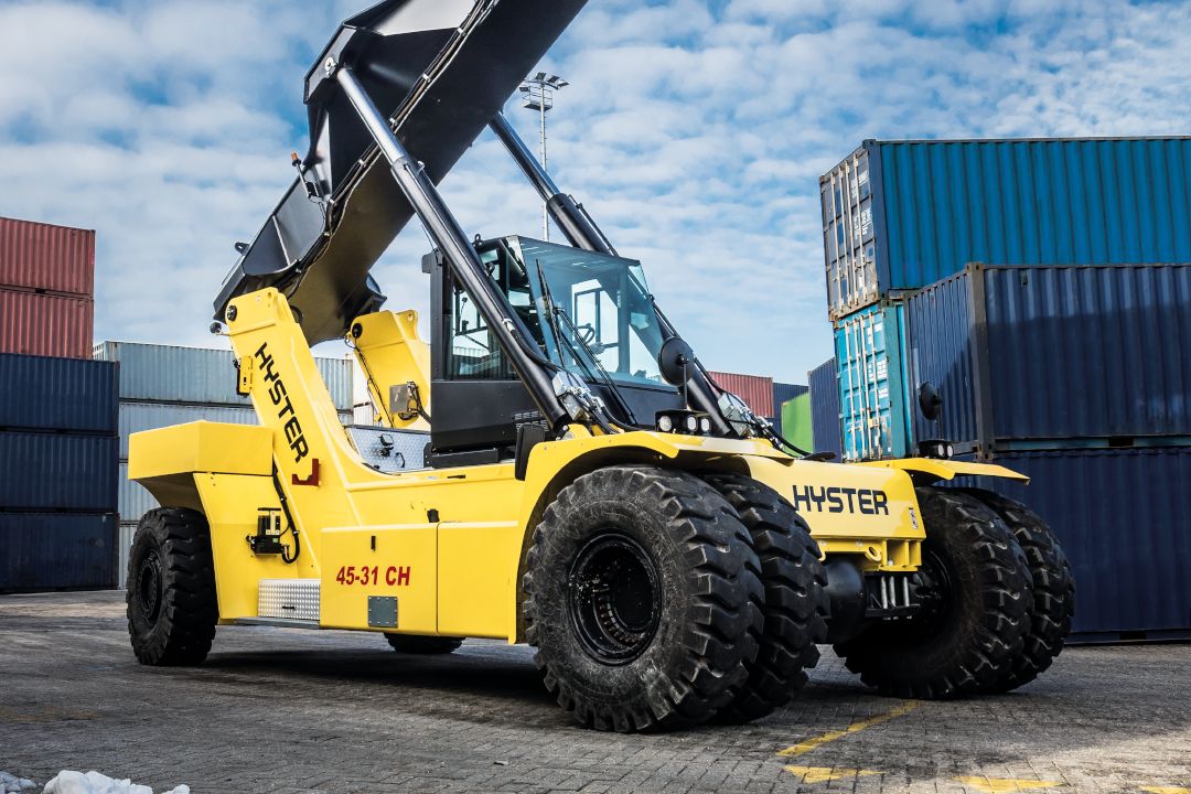 RS45-31CH 正面吊主要用于高强度集装箱堆放应用,通常可处理5 层、3 排集装箱,同时还配备了现代化的环保型柴油发动机、油浸制动器、坚固的驱动轴和先进的自动档变速器,这种配置可以确保高强度应用期间(例如,Coogee Chemicals 仓库的现场操作),设备能够保持最大生产力和最高稳定性。