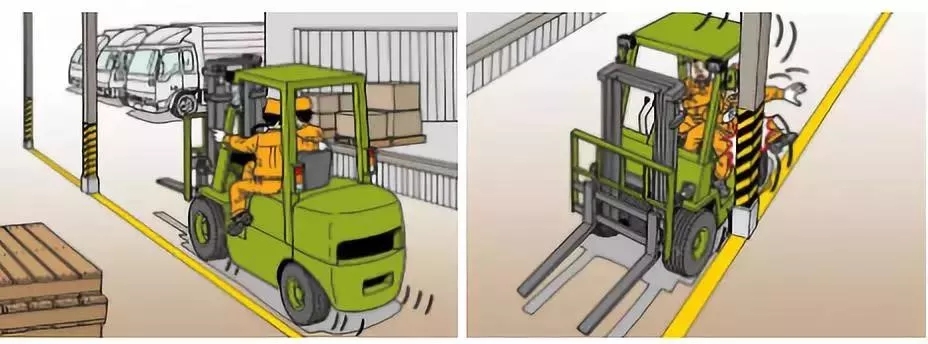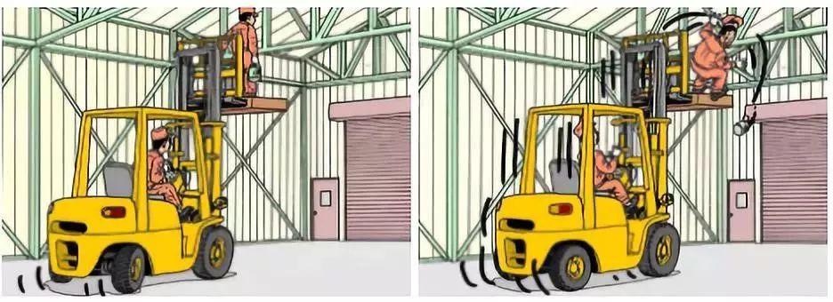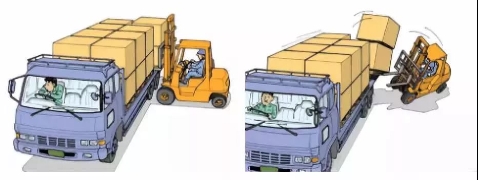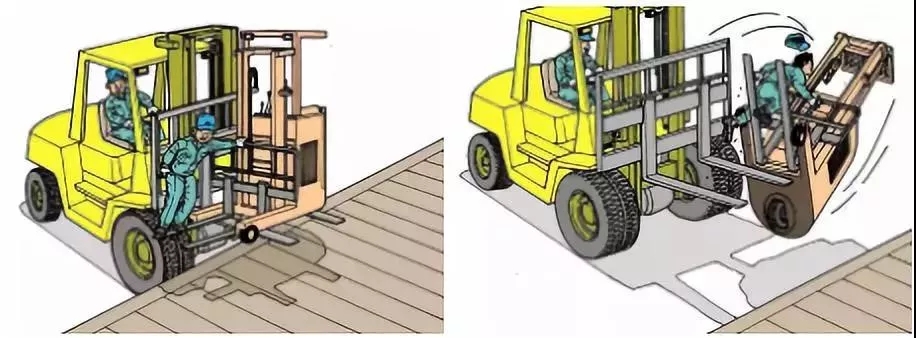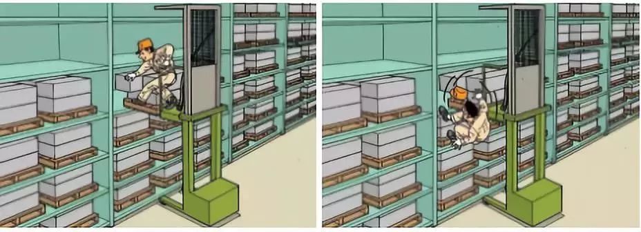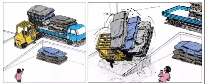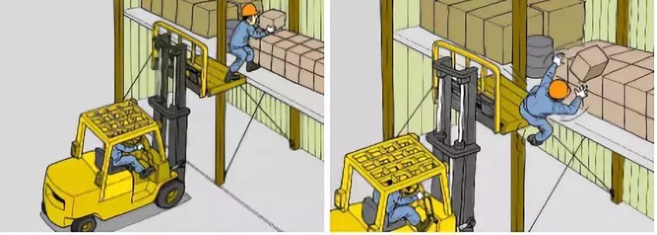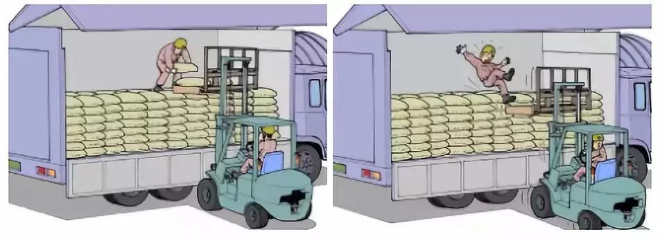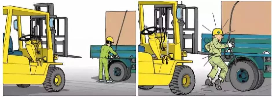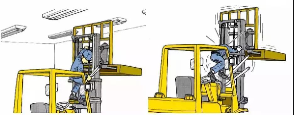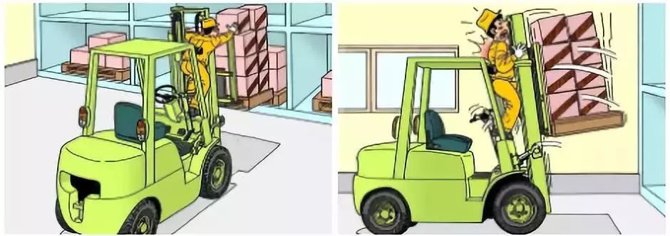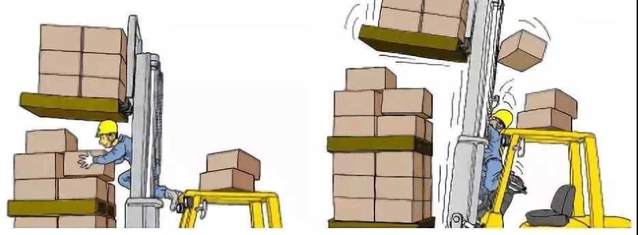一名叉车司机试图站在发动中的叉车上,将托盘上倾斜的货物扶正。叉车司机不小心踩到了后倾手柄,叉车货叉后倾,将司机夹在货叉桅杆与驾驶室之间。