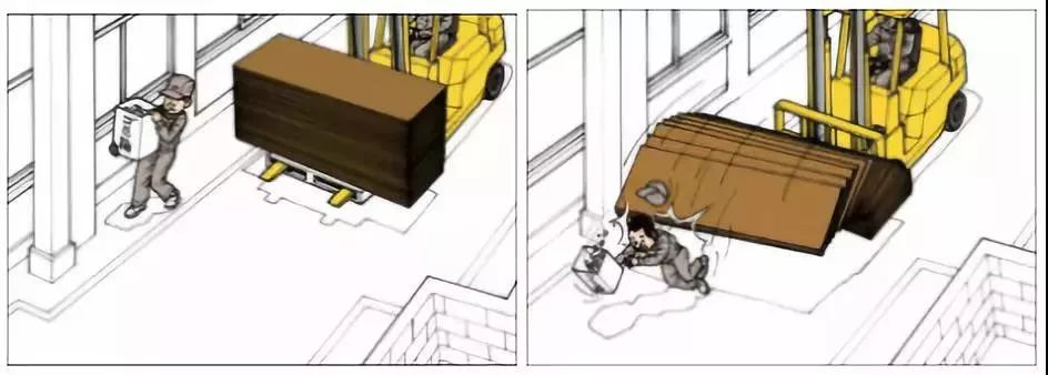 一名工人突然从台阶上走下,被后方载有胶合板的叉车急刹车倾覆的胶合板压倒。