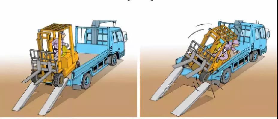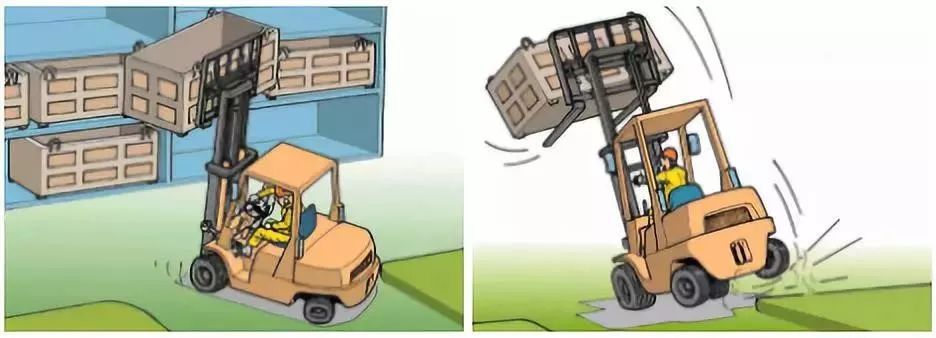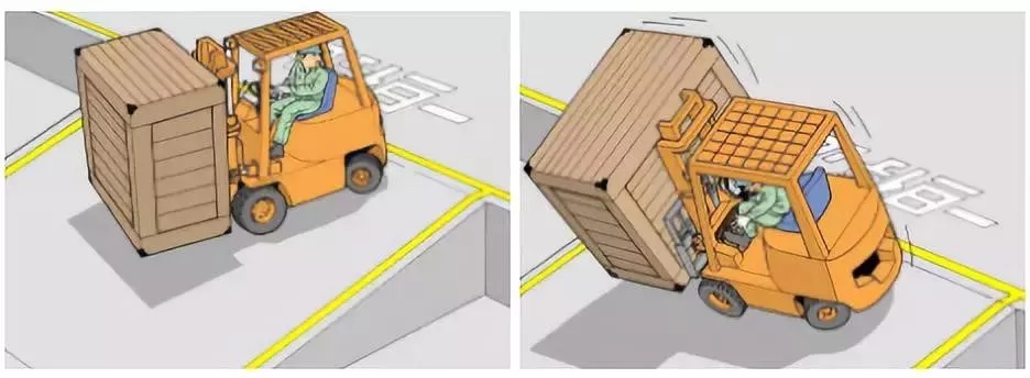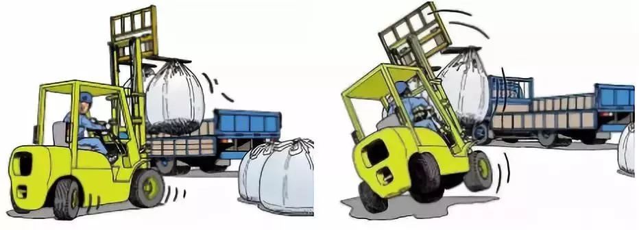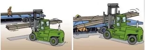 叉车在装货后,倒向离开时,由于过早转向,导致货叉未离开货物,发生倾翻。