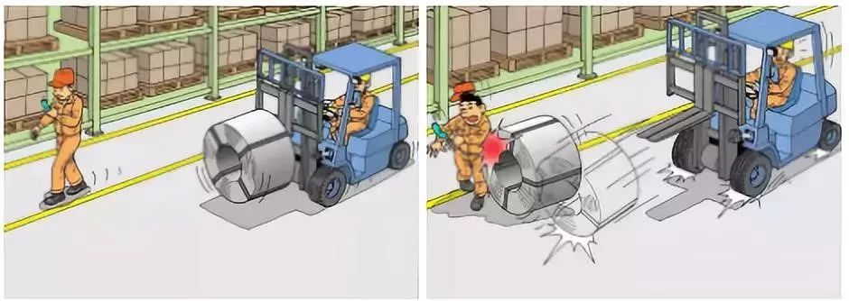 工人突然从行人通道走向机动车道,叉车司机急刹车,卷材滑出,将人压伤。