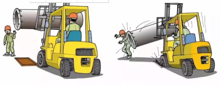 一名经验丰富的叉车驾驶员坐在叉车上指导一名新手驾驶叉车。新手操作失误,打错了方向,使得老司机被夹在叉车和柱子之间。