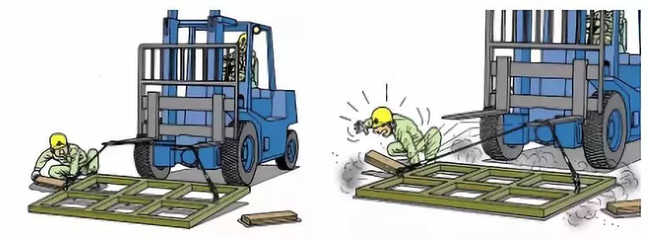 一名员工在铁架下方放木板时,钢丝绳突然从一货叉上脱离,将其压伤。