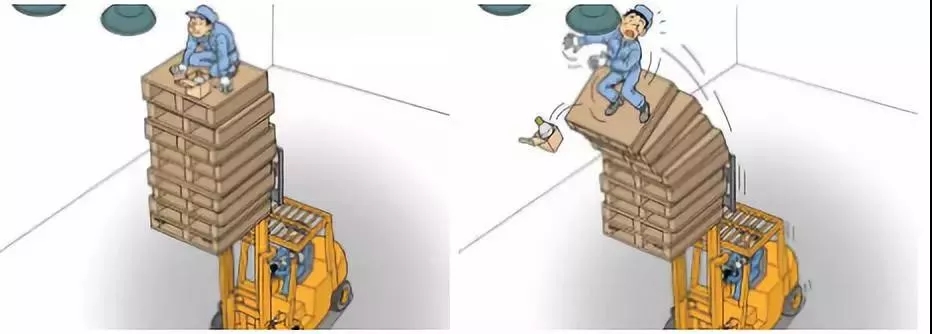 一名工人站在多个托盘上利用叉车当梯子,发生倾覆。