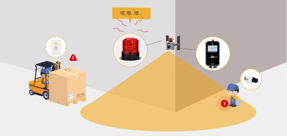 叉车防撞报警系统是专为预防叉车事故而进行开发的专用软件;为了防止和减少以上危险因素与安全隐患情况的发生,在作业车辆上安装车载测距基站,同时在进入作业车辆工作区域的人员身上佩戴上防撞标签,测距基站实时监控150m(可手动调节远近)半径范围内防撞标签的相对距离(精度达到10cm),当人靠近危险范围时,触动作业车辆上方的测距防撞报警器,从使车辆上方的语音报警装置发出报警,提示操作员有人靠近,请远离或停止操作。有效预防、杜绝叉车碰撞碾压员工等高危事故发生。叉车防撞预警系统是世界领先的高精度距离防护系统,其最高测距精度可达10cm.本系统包括:l 车载微基站,安装在作业车辆上;l 电子标签,佩戴在作业人员安全帽上;l 报警器(Alarm),发出语音报警示声音,防止行人靠近;l 连接线缆(Wire),连接系统的各个部分;在叉车防撞预警系统中,主机实时测量和更新与标签之间的距离。当主机与标签之间的距离小于“报警距离”时,主机将驱动报警器进行报警,警示行人远离危险源。典型应用如下图所示。