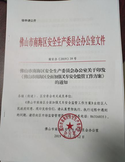为扭转“三区”外叉车安全管理的被动局面,区市场监督管理局牵头起草了《佛山市南海区全面加强叉车安全监管工作方案》(简称工作方案),经过多次研讨及向多部门进行意见征求,于今年12月12日正式形成,由区安委办发文实施。