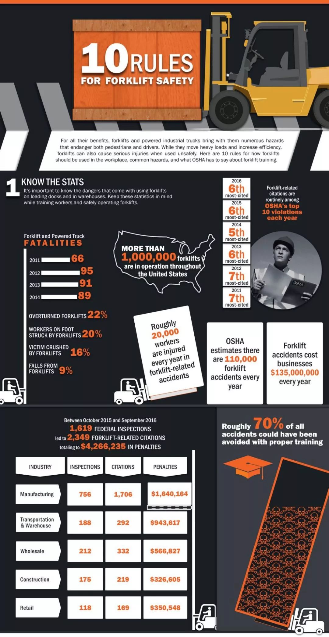 6、每年,与叉车相关的事故,都成为OSHA十大违规行为之一:
