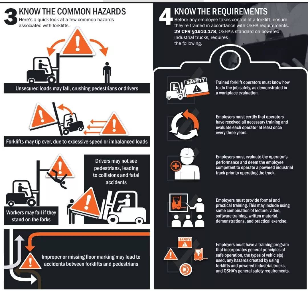 尽管叉车为高效的物料搬运带来好处,如果不正确使用,叉车和工业车辆也会给行人和驾驶员自身带来危险。以下是有关在工作场所使用叉车的10条规则,常见危害以及(美国劳工部职业安全与健康管理局)关于叉车培训的看法。