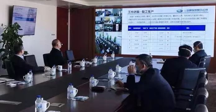 解放发动机事业部党委副书记许海根通过视频连线的方式作了发动事业部疫情防控工作汇报,从员工摸底排查情况、防疫物资筹备情况、相关方防控情况、复工生产准备情况、重点区域防疫工作情况、存在的风险及对策建议等六个方面进行了系统介绍。