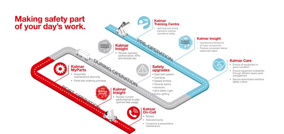 同时,Kalmar Care服务合约有助于客户的安全运营,确保设备运行状况良好,包括定制协议及现有零件流程透明化,以便提升零件可用性以及零件管理流程的效率。专业化服务人员可以协助加强现场安全文化的建立。