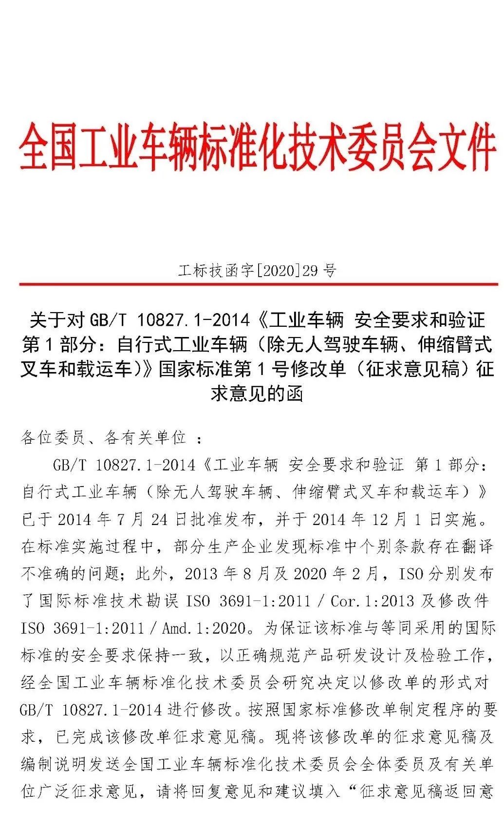 关于对《工业车辆 安全要求和验证 第1部分:自行式工业车辆(除无人驾驶车辆、伸缩臂式叉车和载运车)》第1号修改单征求意见的函