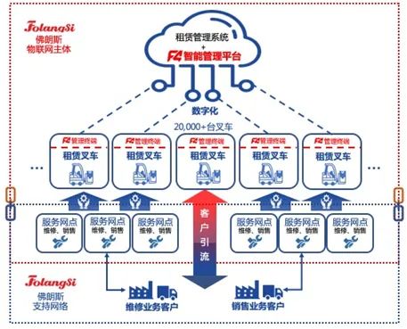 佛朗斯F4智能管理系统是聚焦场内物流设备租赁的具体需求,研发的高效的数字化资产智能管理系统,实现了组织的全面协同和产业数据共享,着重解决了场内物流设备使用的安全问题、效率问题、成本问题和服务问题。公司的物联网数据化能力促进了服务效率和客户粘性的提升,有效支撑了租赁业务的规模化健康发展,为持续、高效、规模化进行数据针对性采集提供基础,实现服务和数据的闭环。