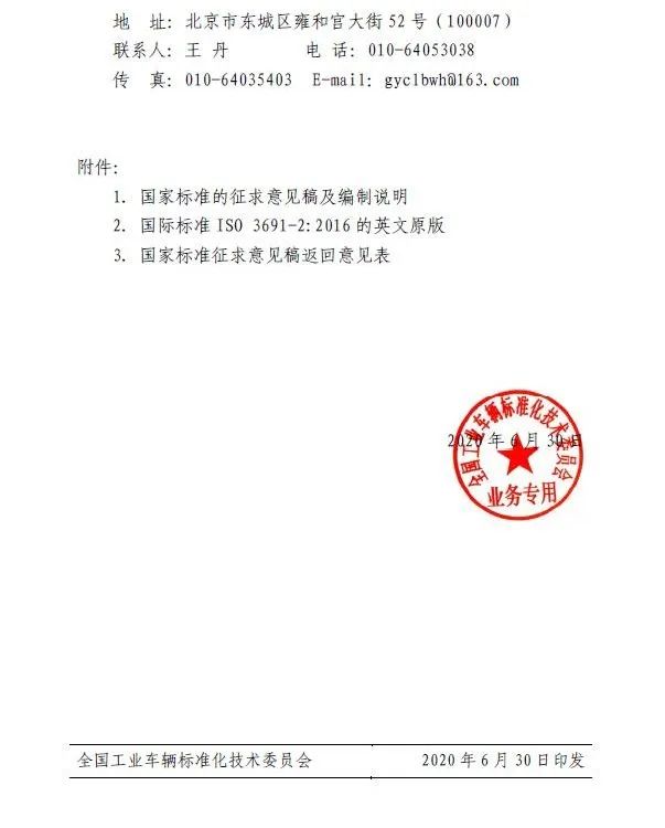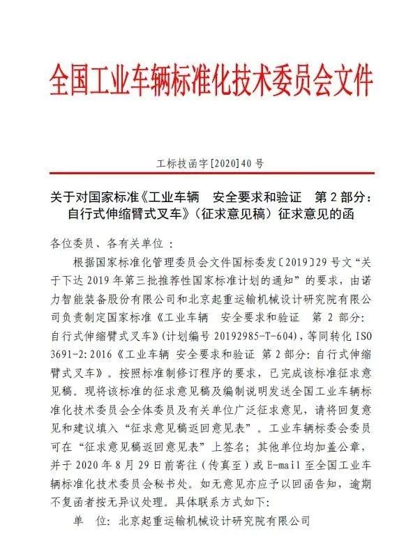 根据国家标准化管理委员会文件国标委发〔2019〕29号文“关于下达2019年第三批推荐性国家标准计划的通知”的要求,由诺力智能装备股份有限公司和北京起重运输机械设计研究院有限公司负责制定国家标准《工业车辆 安全要求和验证 第2部分:自行式伸缩臂式叉车》(计划编号20192985-T-604),等同转化ISO 3691-2:2016《 工业车辆 安全要求和验证 第2部分:自行式伸缩臂式叉车》。按照标准制修订程序的要求,已完成该标准征求意见稿。现将该标准的征求意见稿及编制说明发送全国工业车辆标准化技术委员会全体委员及有关单位广泛征求意见,请将回复意见和建议填入“征求意见稿返回意见表”。工业车辆标委会委员可在“征求意见稿返回意见表”上签名;其他单位均加盖公章,并于2020年8月29日前寄往(传真至)或E-mail至全国工业车辆标准化技术委员会秘书处。如无意见亦应予以回函告知,逾期不复函者按无异议处理。具体联系方式如下: