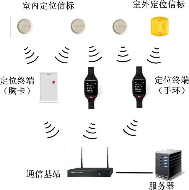 基于UWB 技术的无线定位系统一般由定位标签、定位基站及解算软件构成。通过在特定区域布设合理数量的定位基站,并不间断地采集人员、车辆、资产、工具上的定位标签回传的各个要素的时空坐标数据,实现室内空间实时精确定位、监控、引导、预警等功能。