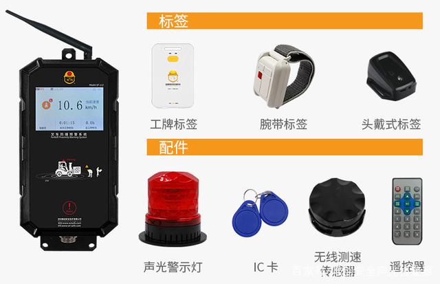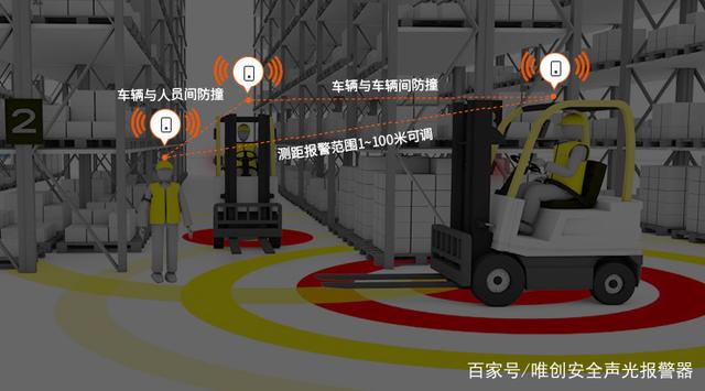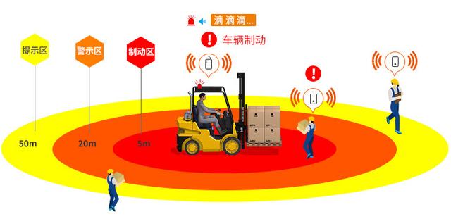 叉车防撞系统的设计充分考虑人机工程学,简化了操作、安装流程。叉车上安装上主机,仓储流动人员佩戴标签,主机和标签之间通过UWB信号可以互相探测,当主机探测到标签,声光报警器会发出报警提示。这套叉车防撞系统的测距精度可达到0.1m,根据实际需求设置三个报警区域:危险区域、报警区域、提示区域;