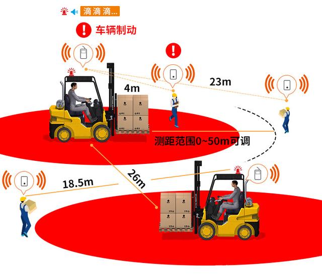安装一套叉车防撞预警系统,通过在叉车上固定安装“防撞主机”,人员佩戴“标签”, 主机实时监控100米(直径)范围内标签的相对距离,根据距离的远近,判断危险程度, 作出不同级别的声光报警,当人员与叉车的距离达到系统设定值时,叉车防撞系统会发出报警,提示叉车司机和行人注意安全,当人员与叉车的距离靠得太近时,比如:距离达到2米、1米时,可以设置叉车限速或停车;就能有效地预防一些因行走不看路、玩手机、视觉盲区引发的车辆碰撞、碾压员工等高危事故发生;