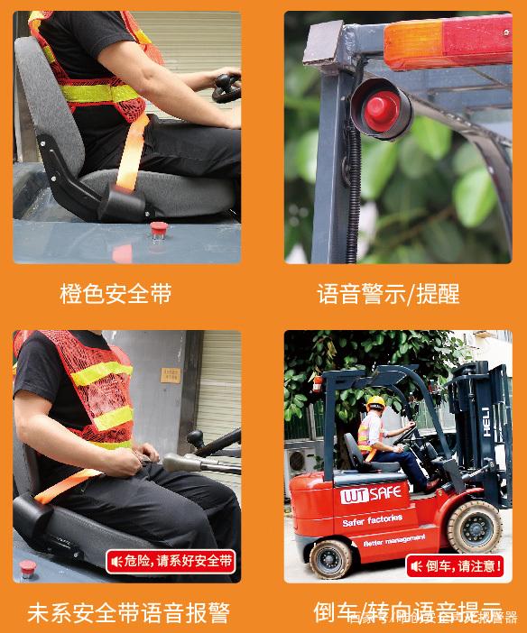 围绕叉车安全,我们在产品设计方面下足了功夫,增加叉车的安全系数。安全带报警器,由安全带和报警器组成,免去另行购买安全带的烦恼。安全带是橙色的,辨识度高。它可以实现以下功能: