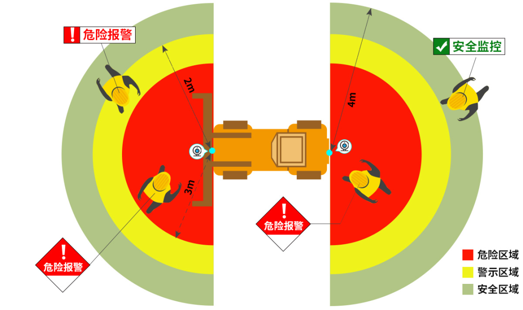 AI 防撞预警系统,可自定义人员与车辆间的距离,设定两个报警区域。驾驶员及仓库人员无需佩戴标签,一旦有障碍物或人员进入危险区域,驾驶员即可得到动态防撞预警,从而有效提升叉车搬运安全。
