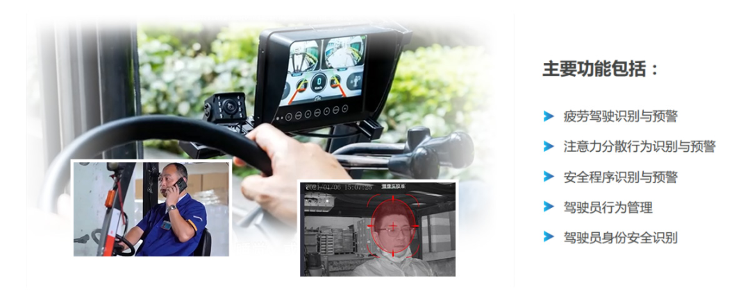 DMS驾驶员监控技术可监控和检测驾驶员疲劳、注意力不集中以及潜在的危险和非法行为。毕竟很多事故与叉车司机注意力不集中息息相关,司机提高警惕也能避免不少危险事故的发生。