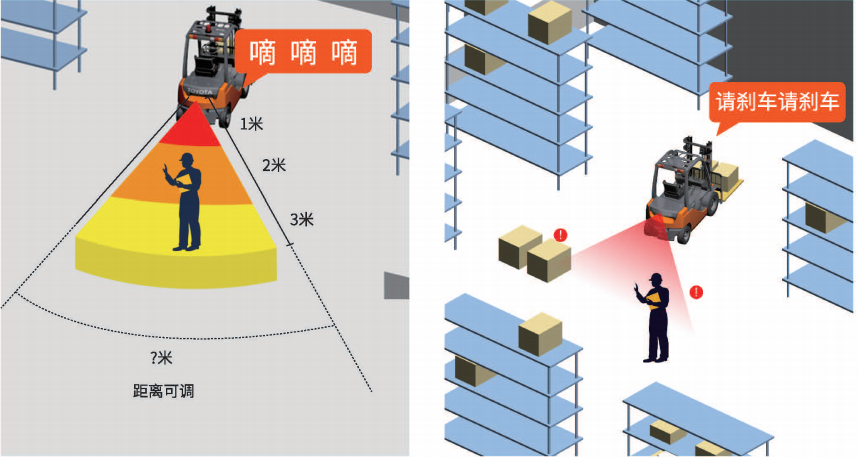 场外场地空旷,行人流动大,做好叉车限速和防撞预警,增强强制干预系统,这里推荐叉车限速器、叉车防撞系统、倒车雷达;