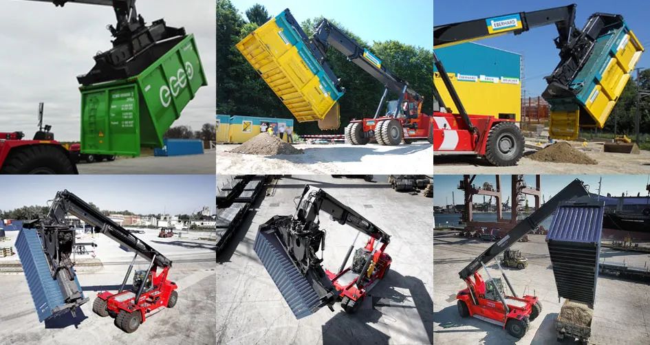 卡尔玛正面吊专用倾斜吊具可安全精准地处理20英尺、30英尺和40英尺集装箱,55度全倾斜吊具可从侧面或纵向卸下集装箱内货物。我们提供2种吊具供您选择,分别用于横向或纵向倾斜。