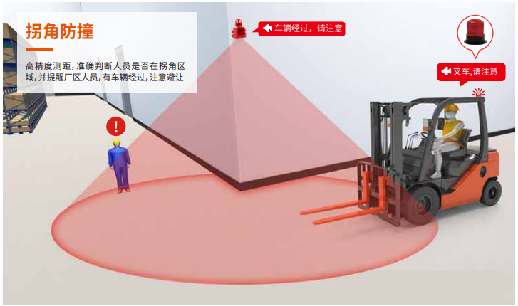 由于视线遮挡,司机未能及时发现行人的存在,可以通过设备来感应行人以及叉车的存在,从而报警。