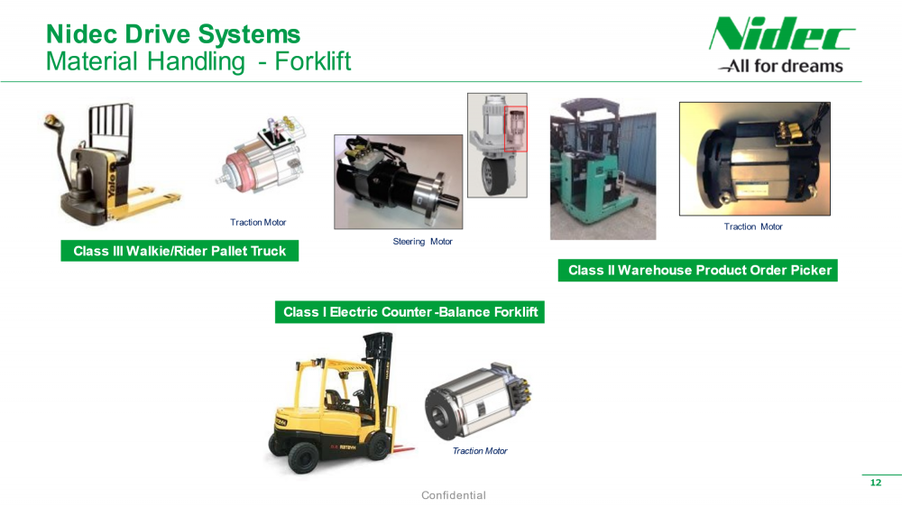 据悉,NIDEC-KDS已经为包括杭叉、合力、BYD、Hyster在内的国内外头部叉车制造商提供优质可靠的电驱动系统。