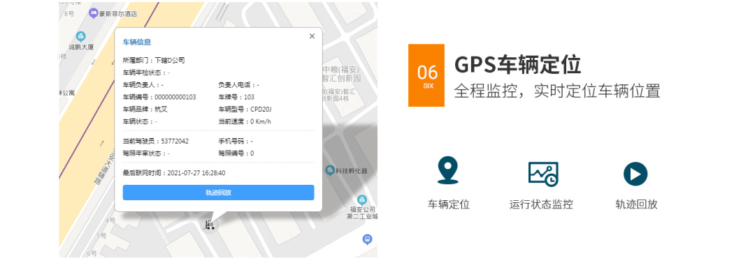 车辆定位、地图轨迹、路径回放等功能,有效降低超范围作业的风险,强化远程监控功能。