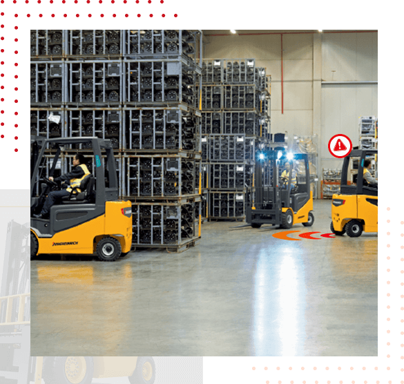一个工作人员可能会误入盲点。团队也可能无法看到叉车倒车,也可能听不到叉车行驶的声音。最后,还有相互碰撞的风险,这时叉车防撞系统就派上用场了。