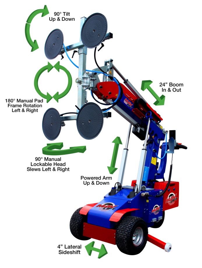 就像MAVLift™的室内玻璃机器人一样,MAVLift 越野玻璃机器人提供 90° 侧向摆动,用于将玻璃或材料运送到狭小的空间。这些 MAVLift 越野玻璃机器人采用高品质组件和周到的工程制造,结构坚固,但并没有失去已成为 MAVLift 名称代名词的精确控制和柔软触感。提供可伸缩、提升、倾斜和旋转电池驱动真空装置的吊杆,设置玻璃从未如此简单。