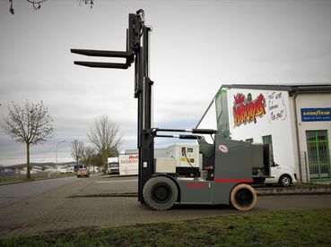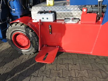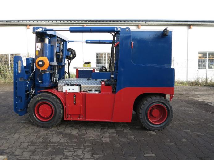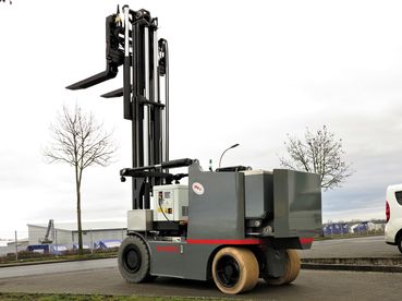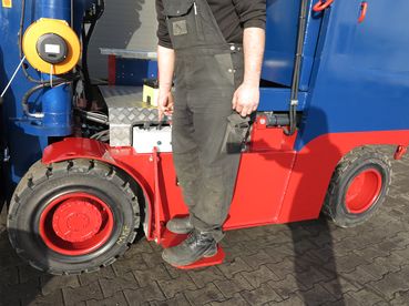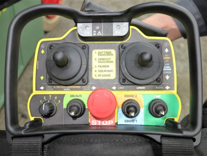 不带驾驶室的遥控电动叉车。所有功能均通过遥控器控制。但是,叉车还可以通过车载操纵杆和(站立)驾驶员座椅直接在车辆上执行最重要的功能。