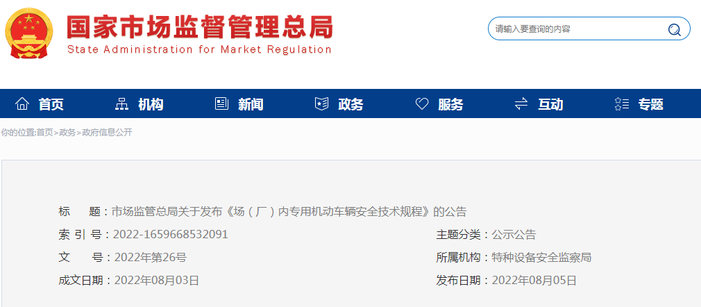为贯彻落实《中华人民共和国特种设备安全法》、《特种设备安全监察条例》,进一步优化场(厂)内专用机动车辆安全监管措施,市场监管总局对《场(厂)内专用机动车辆安全技术监察规程》(TSG N0001-2017)进行了修订,形成《场(厂)内专用机动车辆安全技术规程》(TSG 81-2022),已于2022年8月5日由市场监管总局公布,并于2022年12月1日起施行。