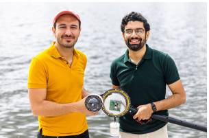 MIT媒体实验室电气工程与计算机科学系副教授兼信号动力学组主任 Fadel Adib(左)和研究助理 Waleed Akbar 展示了他们小组开发的无电池无线水下相机。
