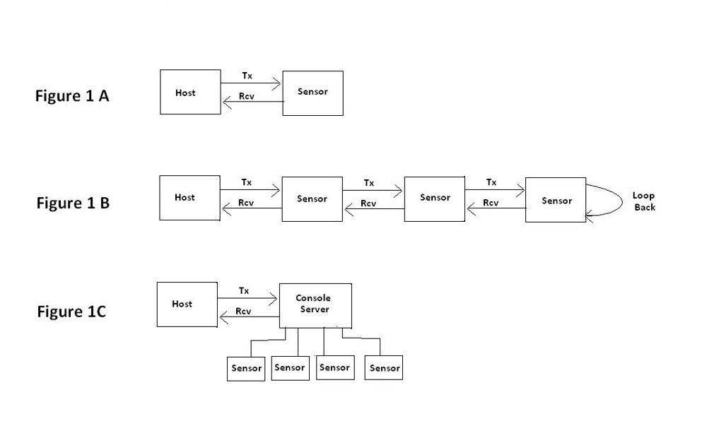 如果设备被配置成一个循环,那么可以取消直通驱动器,所有数据都返回到启动点。对于一个串联或环路结构的网络,数据速率通常被设置为一个单一的波特率。如果使用几个多端口串行控制台控制器,也可以采用树形配置(图1C)。如果来自主机的数据速率足够快,可以提供所有低级别的数据,这允许在串行域中建立多个传感器或传感器区域。如果不是这样,以太网连接可以作为最上层的控制台服务器使用。如果传感器区被定义为一个局部的区域,这可能是一个有帮助的架构。