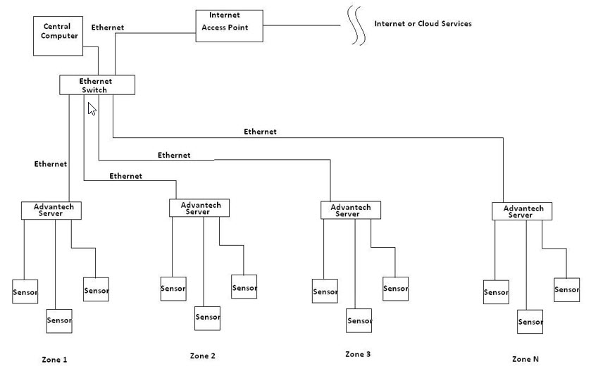 例如,我们可以把一个中央计算机系统想象成主站,它通过以太网交换机连接到串行控制台服务器。这为每个区域提供了高速带宽,其中控制台控制器充当了与各个传感器的互连。