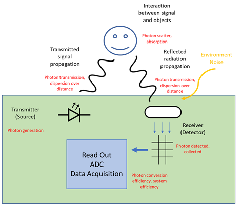 操作条件和环境是了解 ToF 传感器工作原理的关键。图 1 显示了 ToF 传感器的光子“寿命”以及理论上可能出现噪声的位置。红色表示可能出现噪音和/或影响系统最终性能的地方。在接收器处,由于光子有可能“正确地”经历这一系列事件,因此只会收集一小部分传输的光子。
