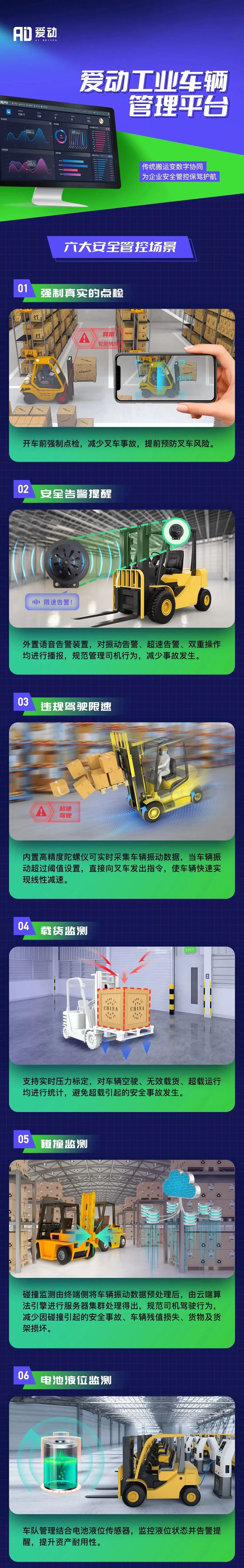 爱动超越人工智能科技(北京)有限责任公司是专注于为工业互联网领域提供基于人工智能的资产管理解决方案的科技企业,多年来和叉车领域各行业用户展开深度合作,持续丰富旗下产品矩阵,推进技术创新。爱动自主研发的针对非道路移动机械、符合国四标准的AD-MiniBox-G4智能车载终端通过权威机构认证,已全面上线,各类机械设备都可以无忧适用,赋予设备运作更多可能性,以实际行动助推“双碳”目标的达成。(点击了解:爱动非道路移动机械信息管理系统通过联调检测!成功接入国家平台)