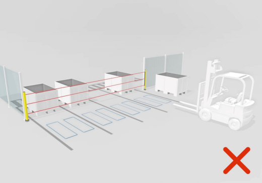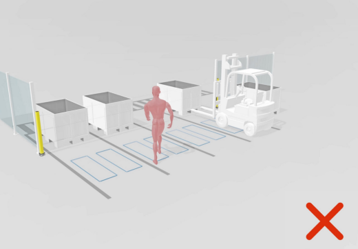 一个明显的方法是使用一种带有感应圈的 "静音 "作为触发信号。感应环作为 "静音传感器 "被嵌入到每个转运站前的地板上,原则上可以区分高架车和人。然而,为了安全地进行区分,通常需要额外的评估措施。然而,这种方法的主要障碍最终是IEC 62046等标准所规定的静音要求没有得到满足。这是因为,如果所有的换乘站都由用于静音的主动式光电保护装置(AOPD)共同保护,那么在一个环路对上出现的叉车就会触发整个区域的静音功能--也就是所有的站。在那一刻,人们可以和叉车一起进入危险区域,而不被发现,也没有意识到。当高叉车站在感应圈上时,静音功能处于激活状态,AOPD的安全功能被覆盖。同时,静音对象(这里是指叉车)和固定极限之间的横向距离太大,因此不再符合要求。因此,传统的静音方法并不适合这种类型的应用。除了安装感应圈需要大量的努力外,该方法还有残留的风险,不符合标准的静音要求。