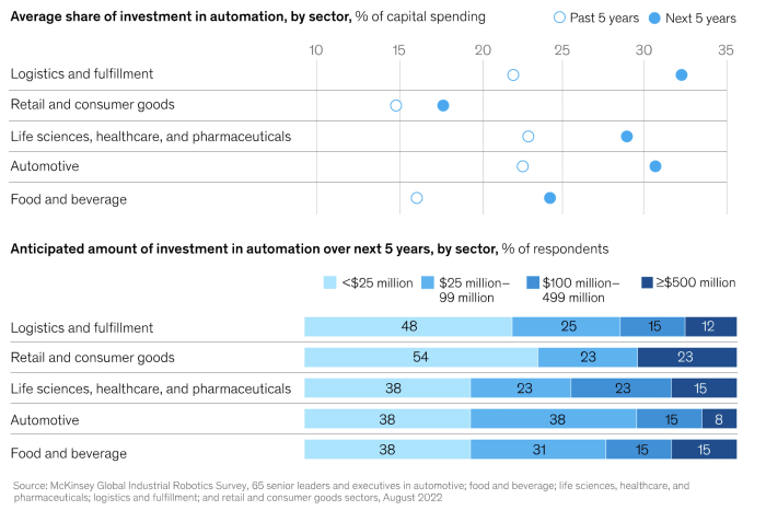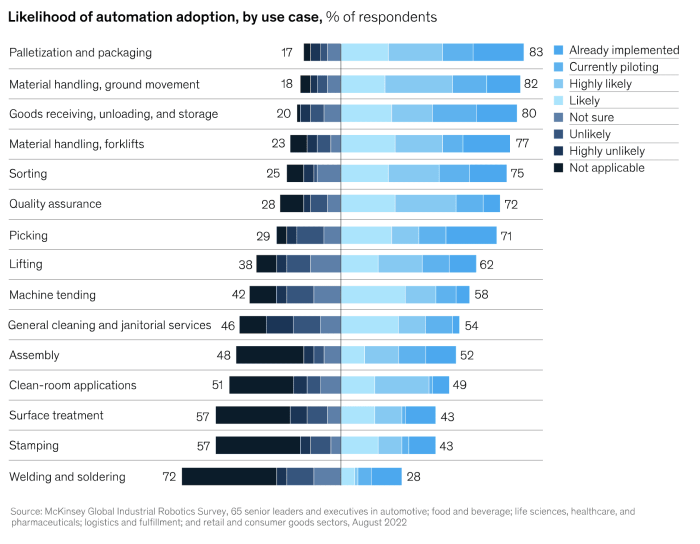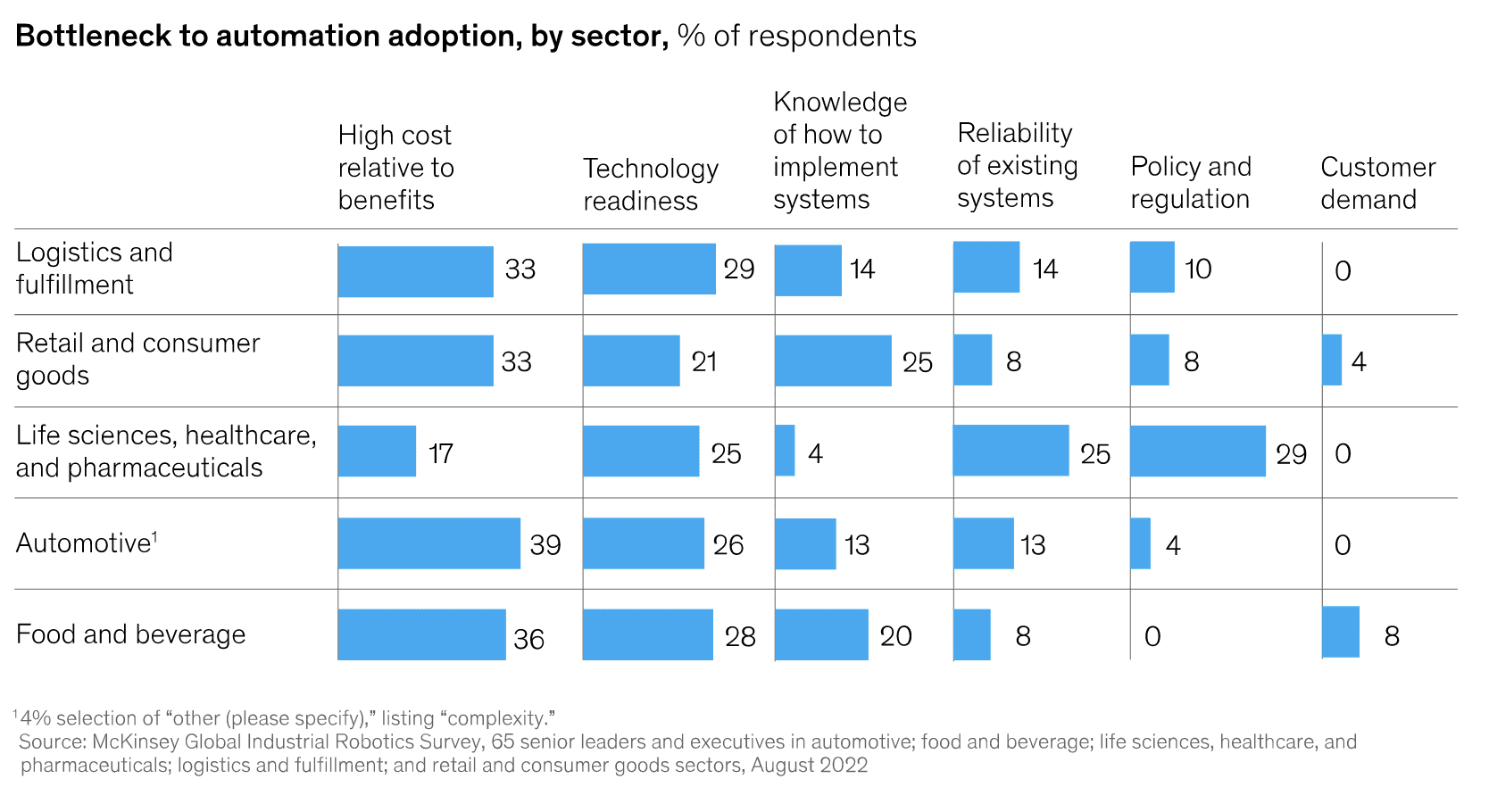 麦肯锡说,采用自动化的主要挑战包括资本成本和缺乏经验,分别有71%和61%的受访者提到了这一点。深入调查发现,汽车行业最关心的是投资回报率(相对于收益的成本),39%的人认为这是他们采用自动化的最大障碍;物流和零售业的这一数字下降到33%,制药业为17%,这表明他们认为新技术最容易推动。