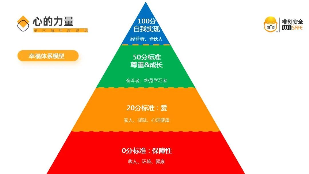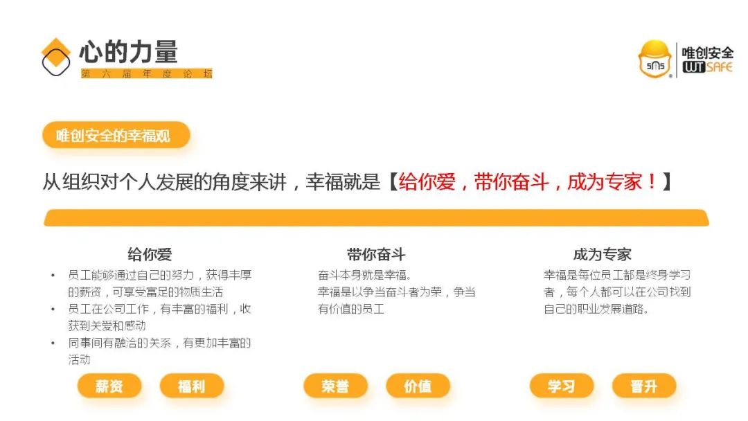 而追求全体“唯创人”物质和精神两方面幸福是这一切的起点。为此我们要清晰定义唯创安全的幸福观,唯创安全的员工幸福体系。从组织对个人发展的角度来讲,幸福就是【给你爱,带你奋斗,成为专家】!