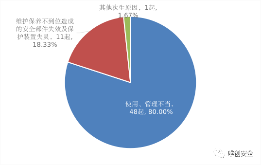 截至2022年年底,特种设备事故共结案60起,根据结案材料分析,事故原因主要分三类:一是因使用、管理不当发生事故,约占80.00%。违章作业仍是造成事故的主要原因,具体表现为作业人员违章操作、操作不当甚至无证作业,维护缺失,管理不善等。二是因维护保养不到位造成的安全部件失效及保护装置失灵的事故约占18.33%。三是其他次生原因导致的事故,约占1.67%。(见图7)